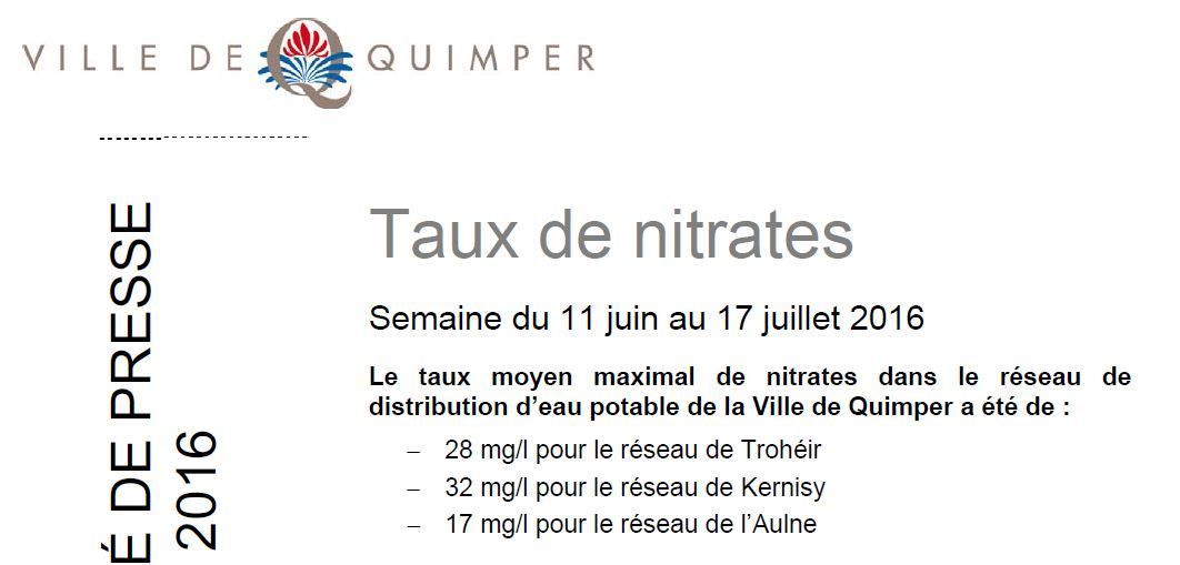 18 Juillet 2016 Publié par Penhars Infos Taux de nitrates à Quimper du 11 au 17 juillet #Brèves Chapelle St-Thégonnec : la source contre les fièvres Fermeture exceptionnelle des mairies annexes le samedi 23 juillet