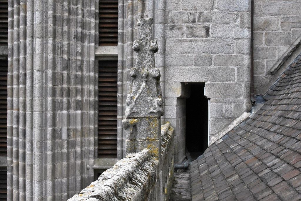 Nos pompiers ont une grande échelle. Elle leur permet d'atteindre un panneau dans un vitrail que l'on peut ouvrir de l'extérieur et repérable de la place Saint-Corentin par un médaillon rouge à 43 m. Ils peuvent entrer dans une grande pièce qui leur donne un accès plus facile aux coursives et aux toits.