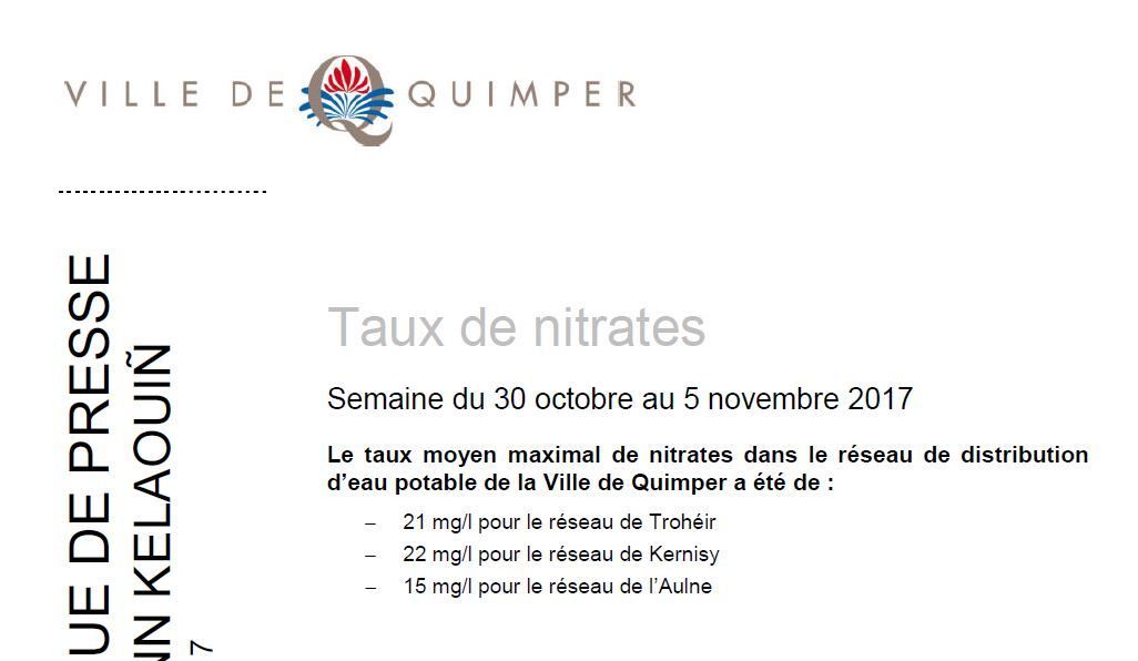 9 Novembre 2017 Publié par Penhars Infos Taux de nitrates à Quimper du 30 octobre au 5 novembre #Brèves Qui mange les ailes des papillons ... Re-Centre ta Ville : une enquête de la JCE de Quimper-Cornouaille