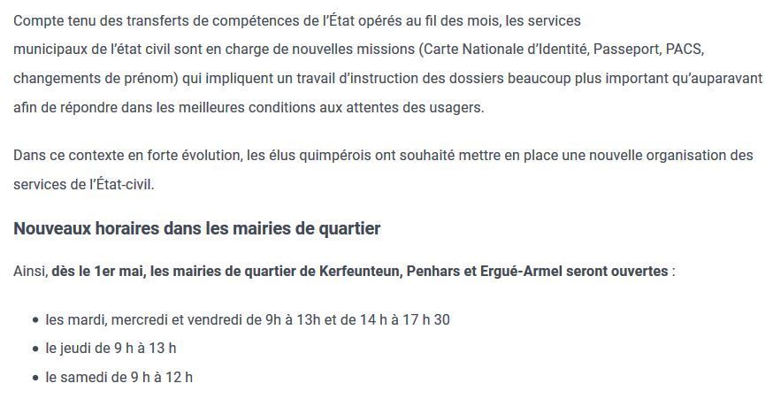 Comme vous le voyez, les bureaux des mairies annexes de Penhars, Kerfeunteun et Ergué-Armel seront fermés au public le lundi toute la journée, le jeudi et le samedi après-midi. Les horaires de la mairie centre sont inchangés. Cette nouvelle organisation prévoit également la mobilité des 18 agents vers les différents bureaux.