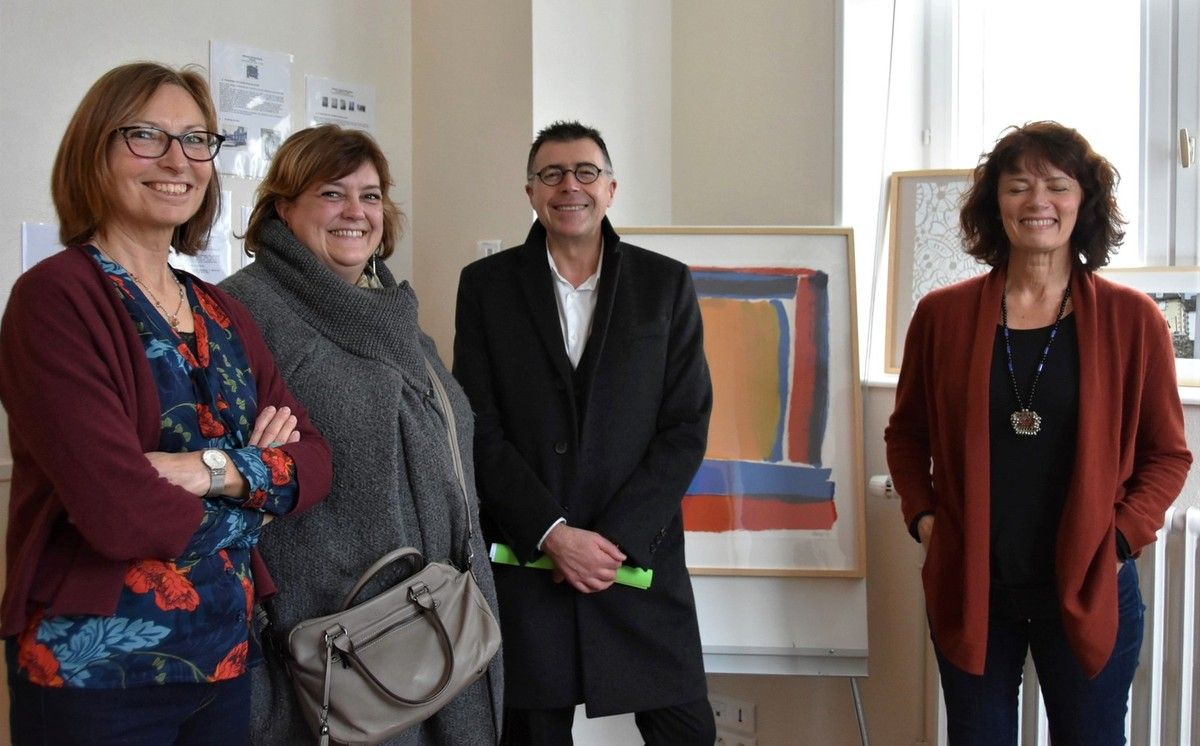 De chaque côté, Christine Evanno et Marie-Hélène Maguet, fondatrices de l'artothèque scolaire. Au centre, Sylvie le Goalher de la direction Enfance et éducation, Allain Le Roux, adjoint chargé de la culture Pour sa deuxième année de fonctionnement, l'association...